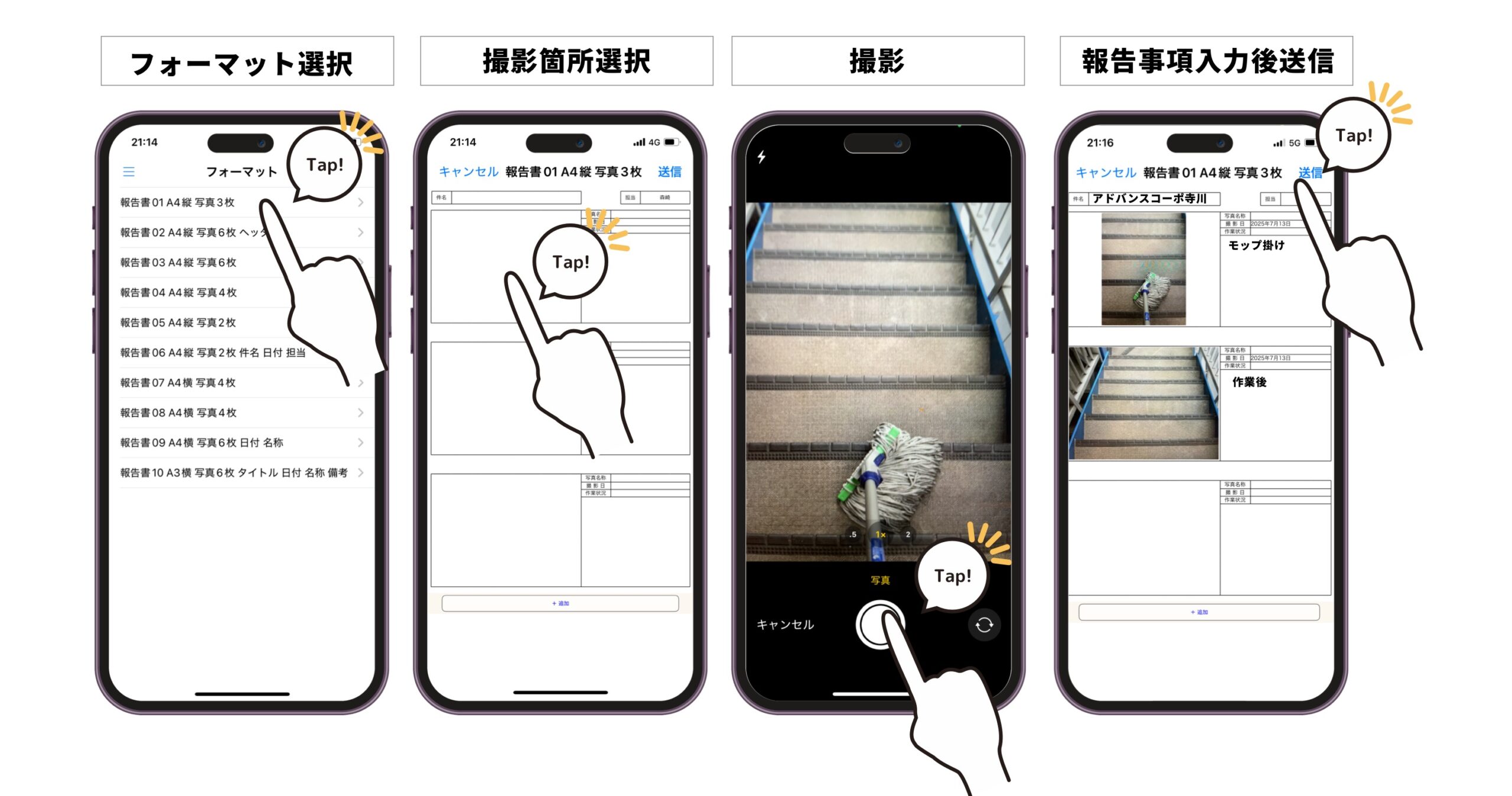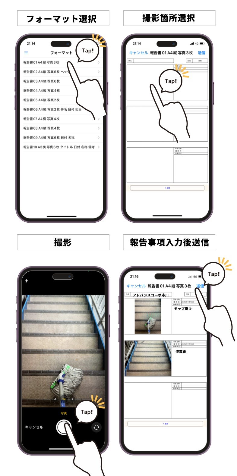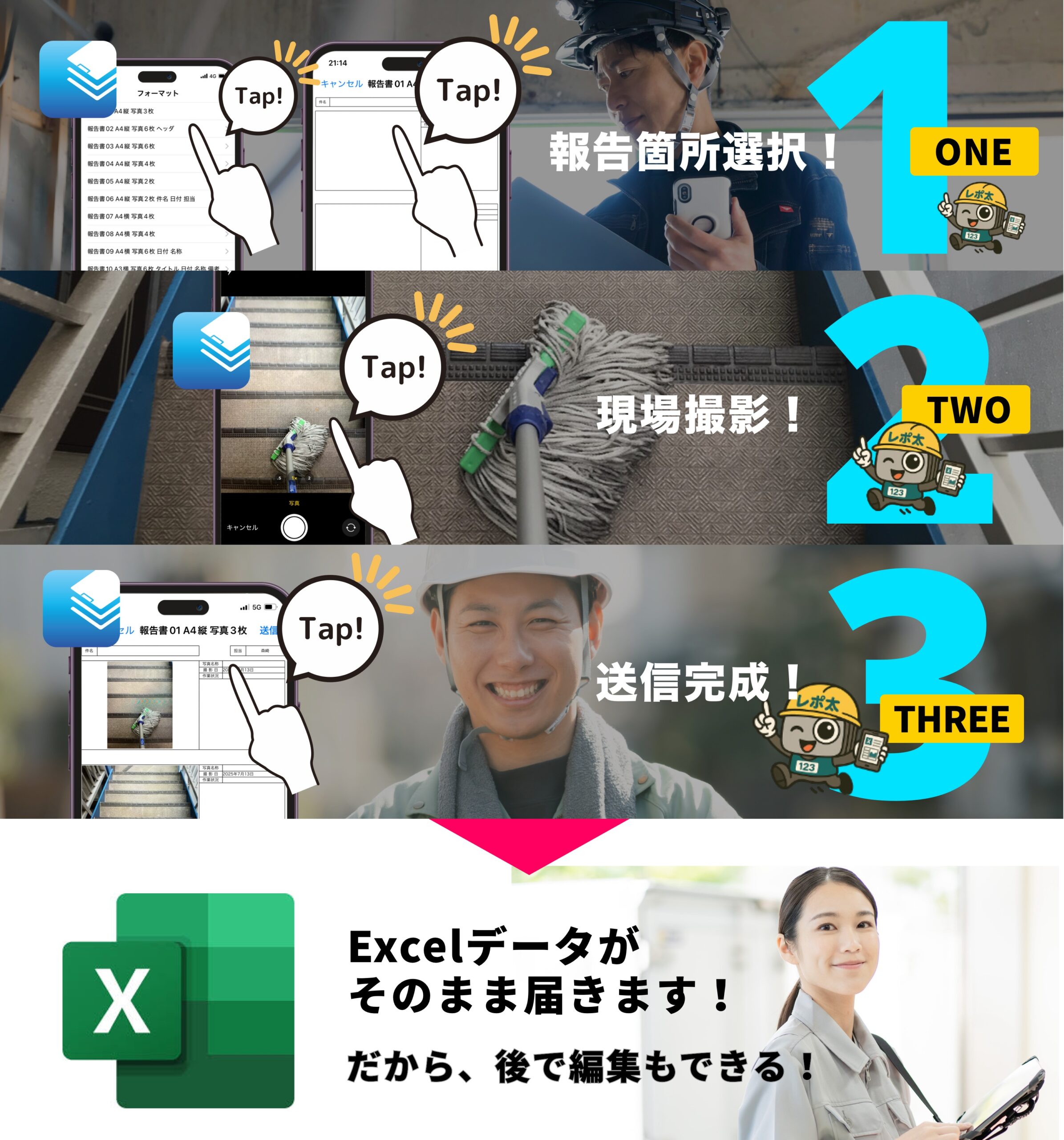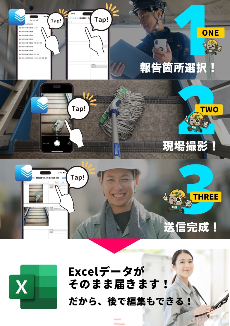 お使いのスマホで写真を撮るだけで、所定の枠に写真がピッタリと収まります。「撮影」「コメントを記入」「送信」の3つの手順で、誰でもカンタンに現場から報告書作成が完了します!