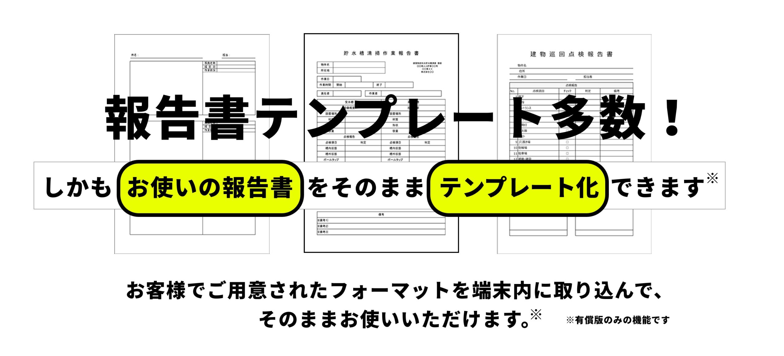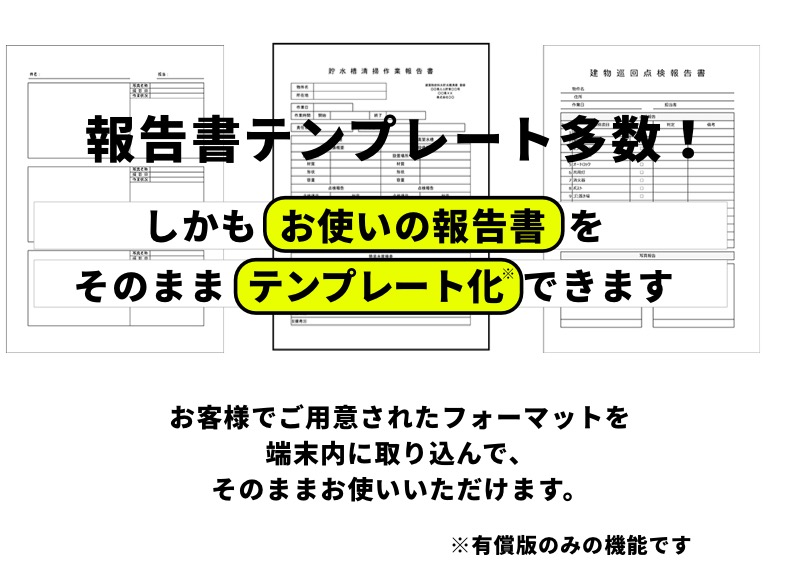今お使いのフォーマットを、お使いの端末に取り込めます。定期清掃、各種設備点検、現調、インスペクションなどあらゆる業務に対応可能。