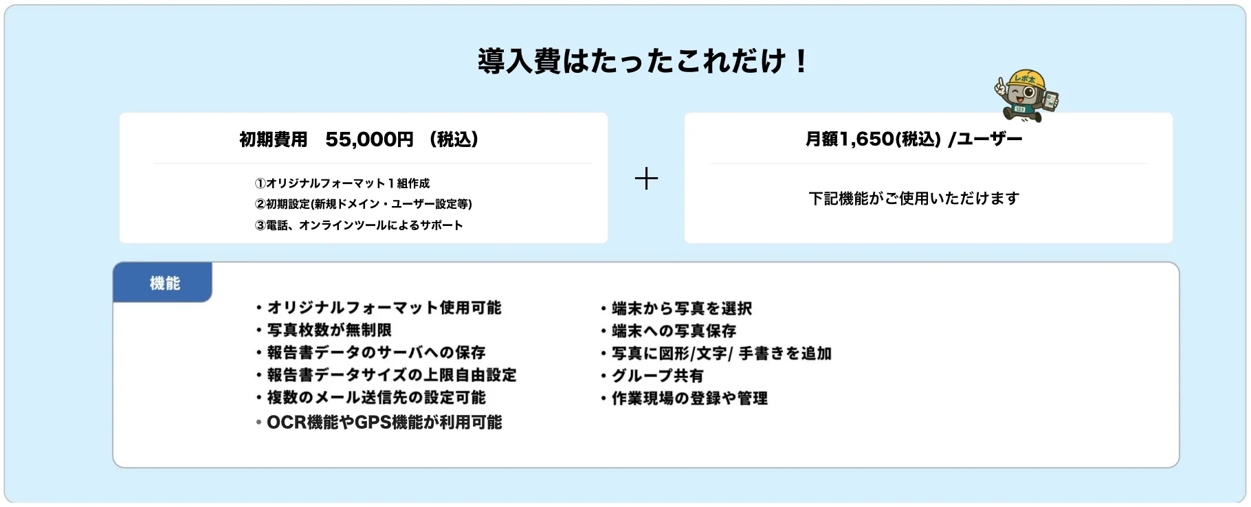 | 現場管理ライセンス 新規追加 | 1ユーザ:3,300円/月(税込) 既存ユーザへの付与は1,650円/月(税込) |
