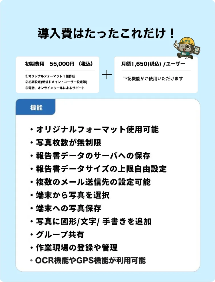 | 報告書データサイズの上限 | 3,000KB (写真30枚程度) | 無制限(初期設定は3,000KB) |