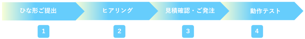 | 3 見積もり 確認・発注 | 仕様に基づいてお見積りをお送りしますので、内容をご確認のうえ、発注していただきます。 |